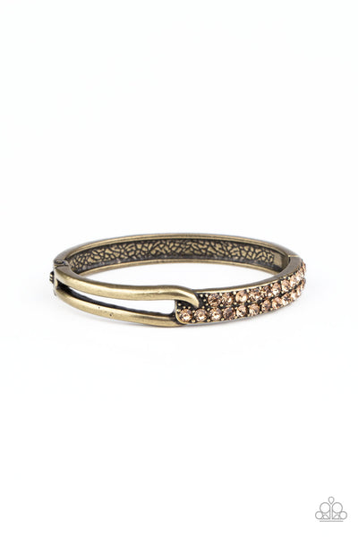 An airy brass fitting links with an antiqued brass band encrusted in two rows of glittery topaz rhinestones across the wrist, creating an edgy bangle-like cuff. Features a hinged closure.