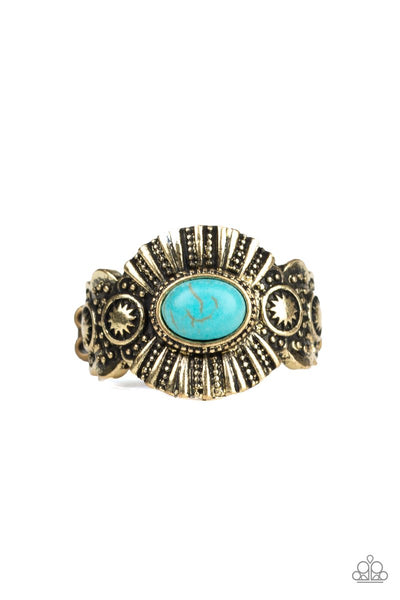 An oval turquoise stone is pressed into the center of an ornate brass frame radiating with linear and sunburst patterns for a seasonal flair. Features a dainty stretchy band for a flexible fit.