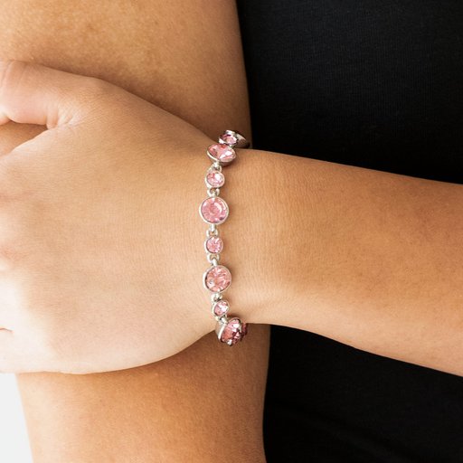 Small and oversized pink rhinestones alternate along the wrist, linking into a timeless centerpiece. Features an adjustable clasp closure.