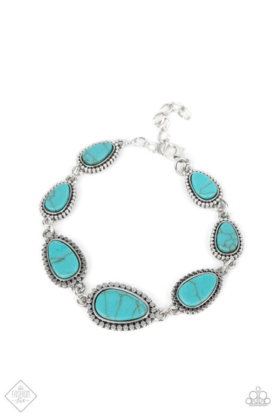 Encased in frames of flattened silver studs, pieces of flat turquoise stone teardrops gradually increase in size as they link around the wrist for an artisan-inspired look. Features an adjustable clasp closure.