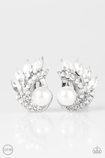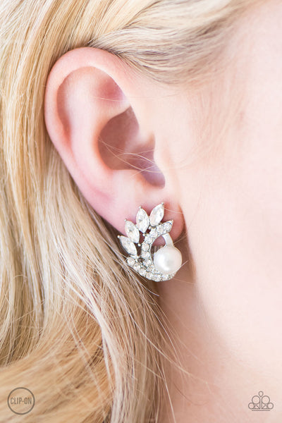 Featuring regal marquise and classic round cuts, glittery white rhinestones fan out from a pearly white center, creating a sassy industrial shimmer. Earring attaches to a standard clip-on fitting.
