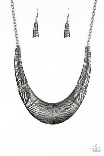 Etched in linear patterns, dramatic gunmetal plates connect below the collar, joining into a fierce crescent-shaped pendant for a statement making look. Features an adjustable clasp closure.