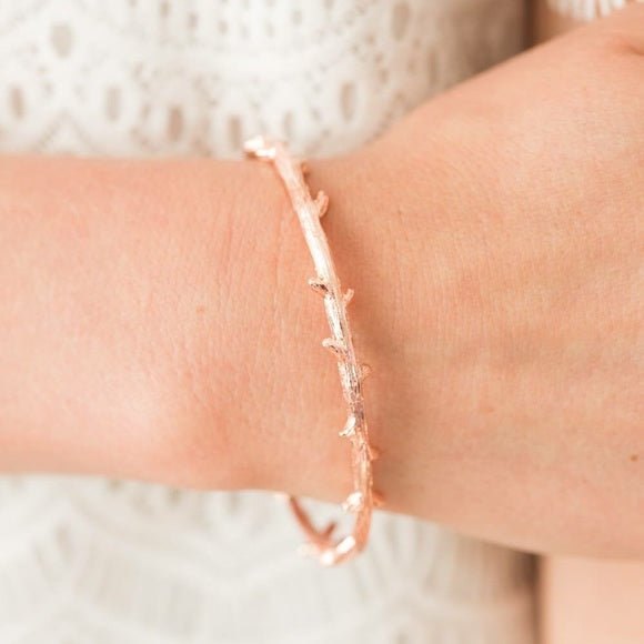 Brushed in a shimmery finish, a dainty rose gold branch curls around the wrist, creating an earthy cuff.