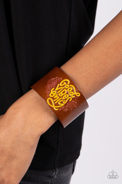 A thick band of brown leather is stamped with the upbeat message, "Good Vibes Only," in a vibrant shade of Primrose Yellow. Vine-like patterns bloom around the curling font, creating a paisley pattern tinted in pink. Features an adjustable snap closure.
