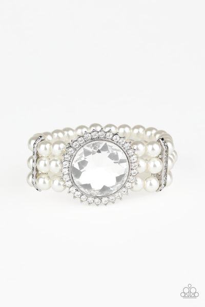 Threaded along stretchy bands, strands of pearly white beads are held in place with white rhinestone encrusted fittings around the wrist. Bedazzled in a ring of glassy white rhinestones, a dramatically oversized white gem adorns the center for a speechless finish.