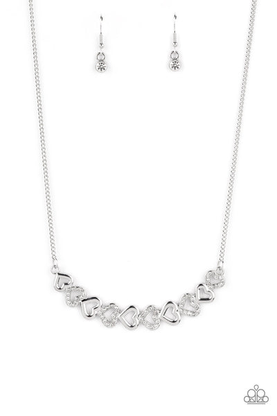 Silver, heart-shaped silhouettes are tilted on their sides, falling in line with variations of the same silver frames encrusted in white rhinestones. The alternating pattern of metallic sheen and glittery shimmer adds eye-catching detail, as the hearts connect into a curved pendant that sits just below the collar. Features an adjustable clasp closure.